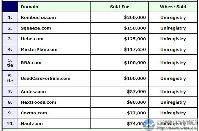 DN榜:印尼“康普茶”竟賣出132萬元! 多個英文域名六位數美金成交!西部數碼(west.cn)9月21日消息,最新一期的DN榜(9.11-9.17)被Uniregistry平臺此前交易但未公布價格的域名占據。其中,賣價最高的是一枚印尼語域名kombucha.com,成交價為200,000美元,約合人民幣132萬元。