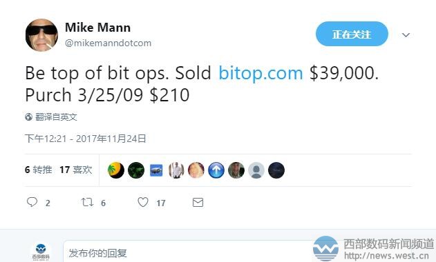 比特幣的風(fēng)大佬也要跟!Mike Mann超25萬元出售域名bitop.com西部數(shù)碼(west.cn)11月27日消息,比特幣的這把火已經(jīng)持續(xù)燒了很長時間了,光是今年以來,相關(guān)域名就跟著水漲船高,不少投資人因此獲利頗豐。當(dāng)然域名圈最會銷售域名的人也不例外,上周五Mike Mann就以39000美元出售了域名bitop.com,約合人民幣25.7萬元。
