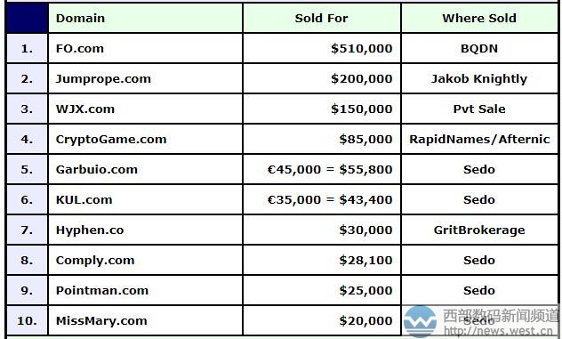 DN榜:兩字母域名FO.COM以321萬元奪魁! “跳繩”超120萬元成交3月15日消息,DN榜剛剛發(fā)布了新一期的域名交易情況(3.5-3.11),兩字母域名FO.COM以510,000美元登上冠軍寶座,約合人民幣321萬元。