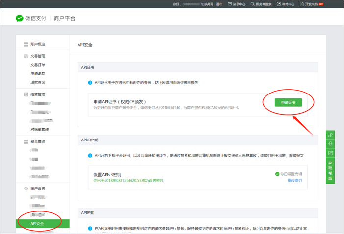 2.3 獲取API證書注意:請務(wù)必按照操作流程去下載證書,期間請不要關(guān)閉工具等相關(guān)程序,如生成了證書關(guān)閉工具的話,會導致證書無法下載,只能等48小時之后重新生成。(證書一年只能生成3次,下載后請保存好) 一、如何判定證書類型為【權(quán)威CA頒發(fā)的API證書】登錄微信支付商戶平臺點擊APT安全,出現(xiàn)如下圖所示則為權(quán)威CA頒發(fā)的API證書