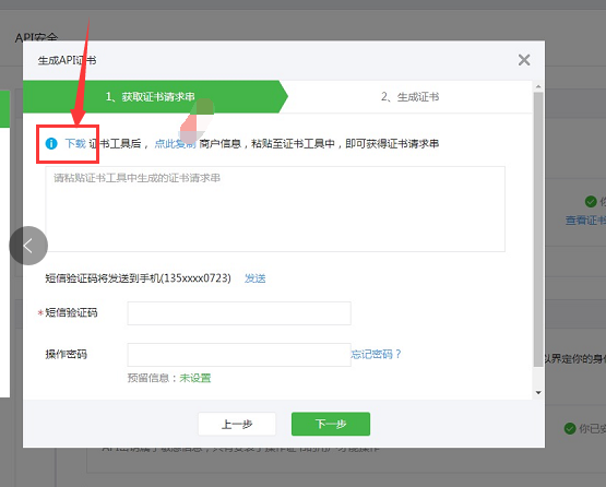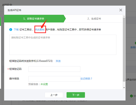 6、在證書工具里復(fù)制的證書串點后返回【微信支付商戶平臺】,將復(fù)制的證書請求串粘貼至生成aid證書的頁面,并輸入短信驗證碼及操作密碼,點擊下一步
