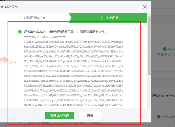 7、點擊下一步后會生成證書串【此時系統(tǒng)將認為申請證書成功】點擊【復(fù)制證書內(nèi)容】