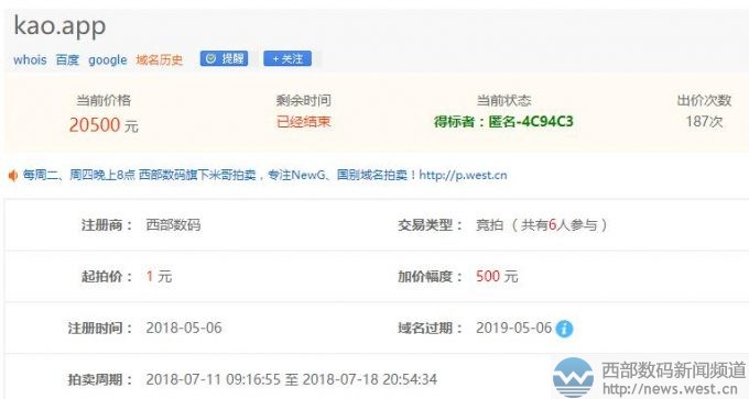 單拼域名kao.app在西部數(shù)碼五位數(shù)結(jié)拍!7月20日消息,.app域名自開(kāi)放注冊(cè)以來(lái),其受關(guān)注的程度一直居高不下,相關(guān)域名交易案例也時(shí)常傳出。據(jù)西部數(shù)碼最近成交記錄顯示,多枚.app域名完成交易,其中單拼域名kao.app以20,500元競(jìng)拍,雙拼域名haoqing.app則以10,000元一口價(jià)被秒。