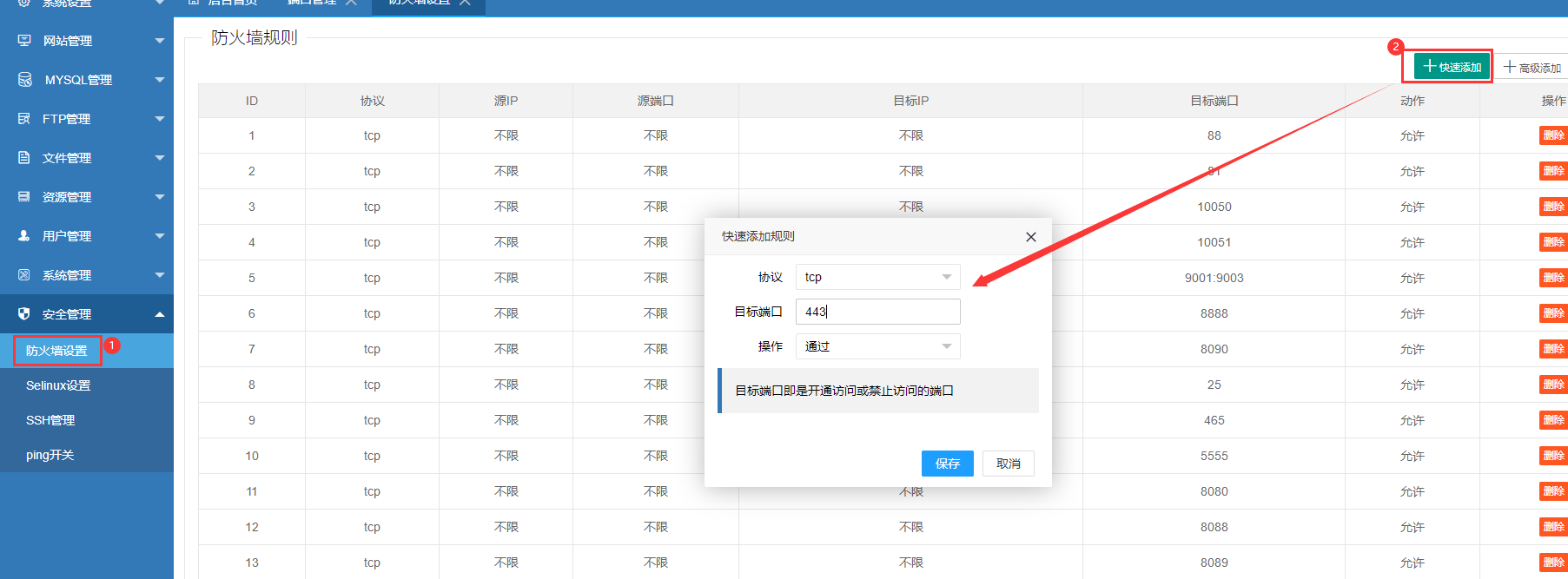 linux系統(tǒng)防火墻開啟放行其他端口我司彈性云主機(jī)默認(rèn)在外部未對(duì)端口進(jìn)行限制,如果服務(wù)運(yùn)行后端口外部不通,可參考本教程在防火墻放行對(duì)應(yīng)端口。 1、WDCP 系統(tǒng)端口放行: (1)3.2版本 登錄wdcp面板后點(diǎn)擊“安全管理”——“防火墻設(shè)置”——“快速添加”,如圖填寫端口(協(xié)議默認(rèn)都使用tcp),保存即可放行。
