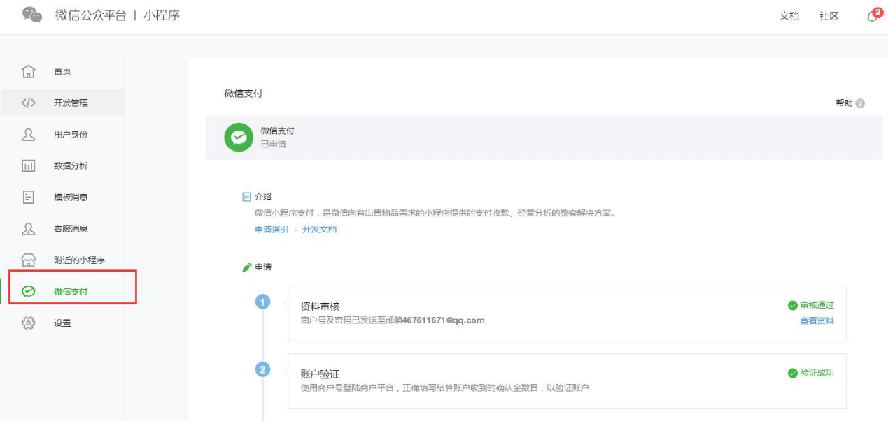 3.微信支付(無需線上支付功能跳過該章節(jié))3.1申請(qǐng)微信支付如您使用商城類等涉及線上支付小程序,需申請(qǐng)主體認(rèn)證,通過后即可申請(qǐng)微信支付。個(gè)人小程序暫不支持申請(qǐng)微信支付