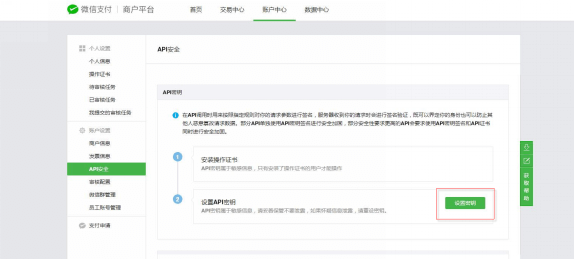 3.2.2 商家密鑰點(diǎn)擊“賬戶中心”->“API安全”菜單,設(shè)置32位密鑰并記錄備份,如下圖示; 注意:密鑰填寫錯(cuò)誤會(huì)導(dǎo)致支付異常,如期間修改請(qǐng)重新登錄商城后臺(tái)同步修改參數(shù)。