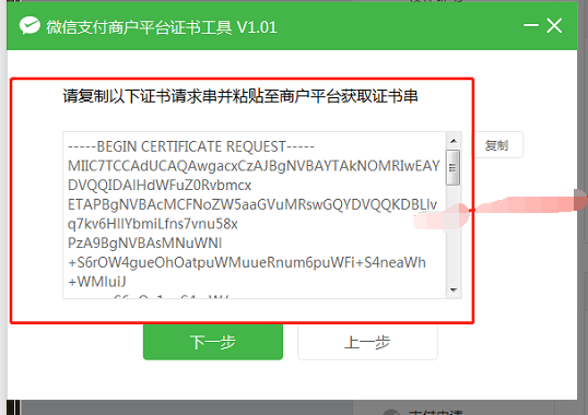7、點(diǎn)擊下一步后會(huì)生成證書串【此時(shí)系統(tǒng)將認(rèn)為申請(qǐng)證書成功】點(diǎn)擊【復(fù)制證書內(nèi)容】