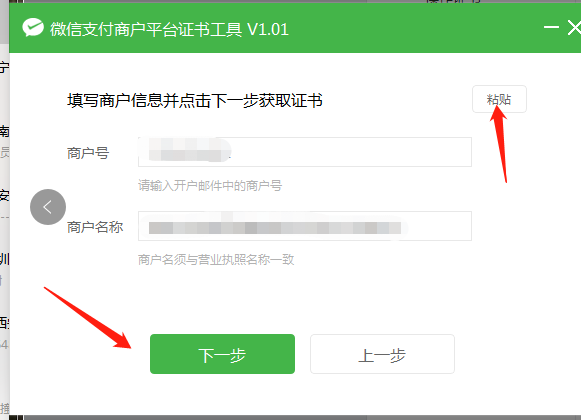 4、復(fù)制好商戶號(hào)和商戶名稱點(diǎn)擊切換至【證書工具】,點(diǎn)擊右上角的【粘帖】按鈕,將先前復(fù)制的商戶號(hào)和商戶名稱粘帖到證書工具中,然后點(diǎn)擊【下一步】