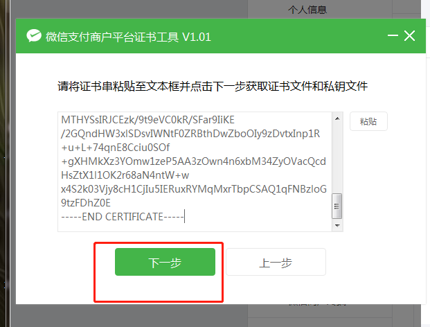 8、復(fù)制好證書內(nèi)容后,切換至【證書工具】頁(yè)面,點(diǎn)擊粘貼按鈕將【證書串】粘貼至證書工具頁(yè)面點(diǎn)擊下一步生成證書文件及私鑰文件