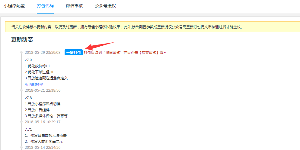 1.3在線更新打包授權(quán)綁定小程序后,在“打包代碼”頁(yè)面點(diǎn)擊【一鍵打包】按鈕打包小程序; 提示:請(qǐng)時(shí)刻留意該頁(yè)面版本更新情況,及時(shí)更新最新軟件版本,達(dá)到最佳體驗(yàn)效果。
