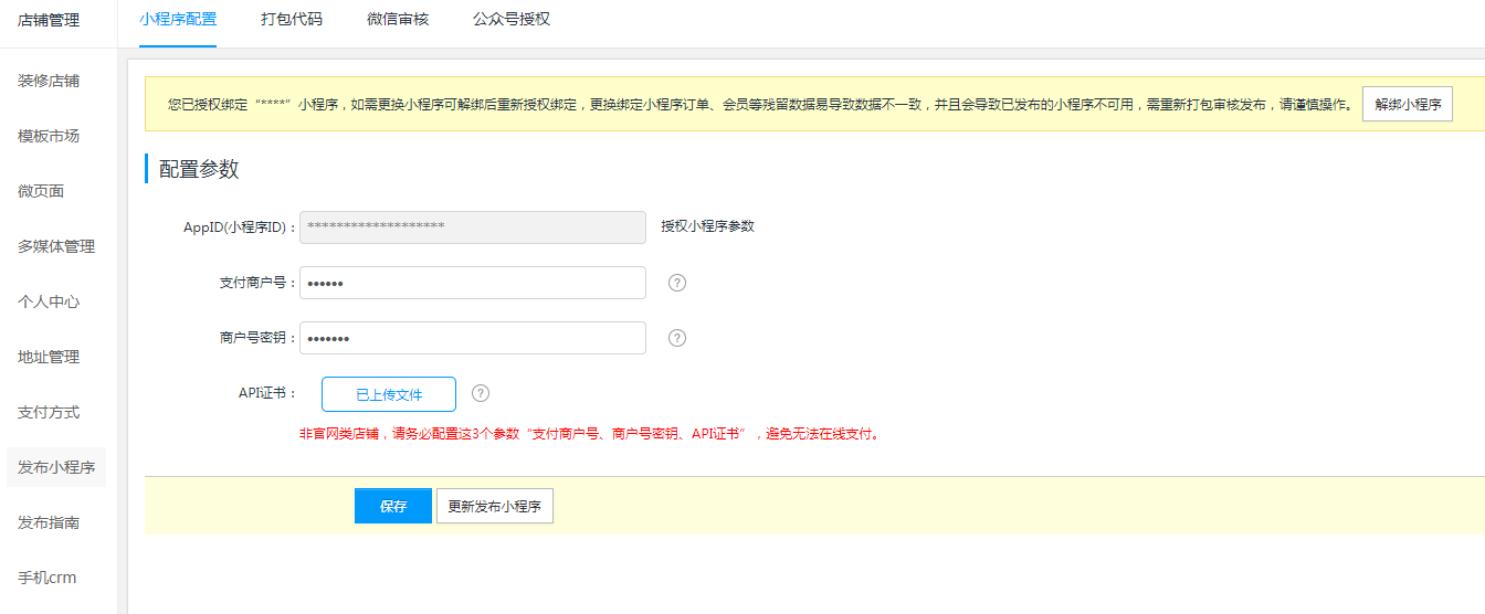 1.2支付參數(shù)配置(不涉及線上支付可跳轉(zhuǎn)本章節(jié))小程序商城等涉及在線支付,授權(quán)綁定小程序后,進(jìn)入小程序配置頁(yè)面,輸入微信支付商戶號(hào)、商戶密鑰、上傳微信支付API證書(各參數(shù)獲取方式上一章節(jié)已說明);