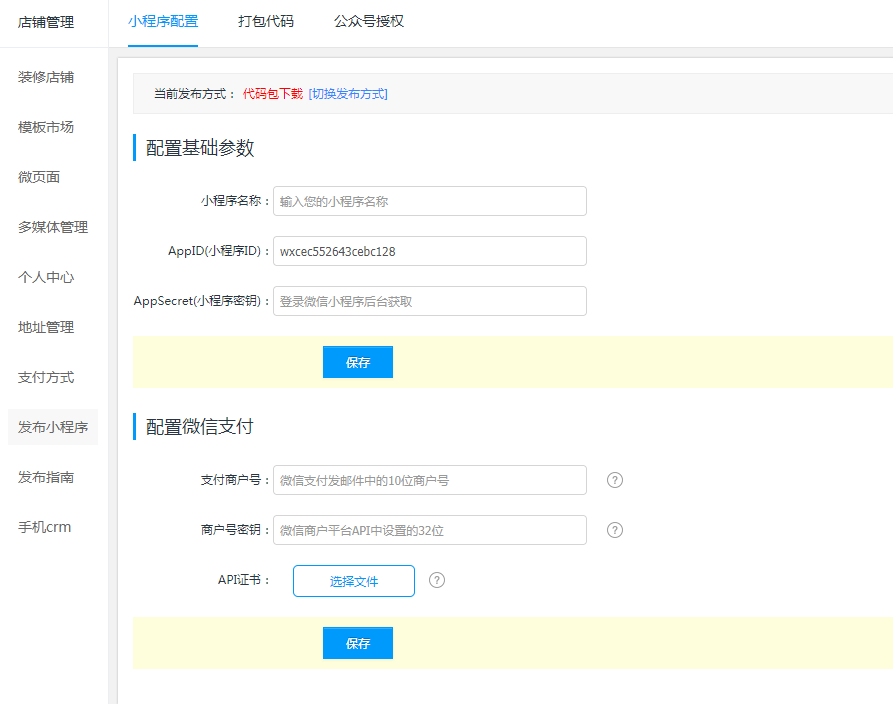 2.代碼下載代碼包下載是在平臺(tái)上下載小程序代碼包,自行通過微信開發(fā)者工具上傳代碼并通過微信公眾平臺(tái)完成小程序?qū)徍、小程序發(fā)布操作,適合對(duì)微信小程序較熟悉的用戶。 2.1配置小程序參數(shù)登錄管理后臺(tái),點(diǎn)擊【店鋪】菜單->點(diǎn)擊【發(fā)布小程序】->點(diǎn)擊【小程序配置】,配置小程序的參數(shù):小程序名稱、AppID、AppSecret,AppID與AppSecret可登錄微信小程序后臺(tái)——設(shè)置——開發(fā)設(shè)置中獲;