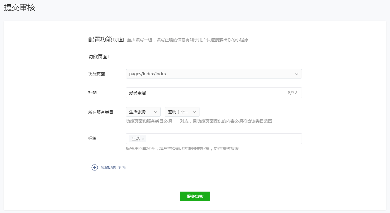 1.4提交審核/發(fā)布提交審核:每點(diǎn)擊【一鍵打包】打包小程序,在“微信審核”頁(yè)面會(huì)將會(huì)生成一條打包記錄,點(diǎn)擊【提交審核】將代碼包提交到微信進(jìn)行審核,微信審核周期一般為7個(gè)工作日,在提交審核前請(qǐng)先認(rèn)真閱讀《微信小程序平臺(tái)運(yùn)營(yíng)規(guī)范》和《微信小程序平臺(tái)常見拒絕情形》; 審核通過:微信審核通過后,點(diǎn)擊【發(fā)布】按鈕,稍等片刻,即可在手機(jī)微信小程序搜索中查到已發(fā)布的小程序,完成發(fā)布流程; 審核失。喝缥⑿艑徍耸≌(qǐng)注意可看失敗提示,及時(shí)登錄微信小程序后臺(tái)處理相關(guān)問題; 注意:同一時(shí)間只允許提交審核1個(gè)小程序。
