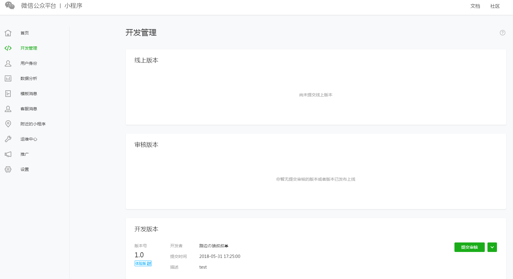2.7預(yù)覽并提交審核登錄微信小程序后臺(tái),在開發(fā)管理中,可以看到上一步中上傳的小程序