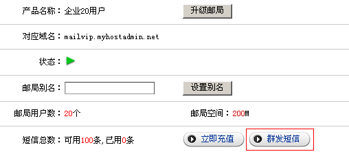 2) 再次確認(rèn)您要購(gòu)買(mǎi)的短信產(chǎn)品型號(hào),并點(diǎn)擊"進(jìn)入下一步" 按鈕; 3) 在購(gòu)買(mǎi)頁(yè)面中輸入您公司的詳細(xì)信息; 4) 短信開(kāi)通定單已經(jīng)添加進(jìn)您的定單中, 5) 進(jìn)入管理中心->;業(yè)務(wù)管理->;郵件管理,選擇我們?yōu)槟_(kāi)通短信服務(wù)器的郵局,點(diǎn)擊管理,進(jìn)入;