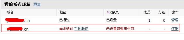 紅色圈起來的域名就是還在驗(yàn)證中的,上邊已經(jīng)有一個(gè)域名已經(jīng)通過驗(yàn)證,域名解析一般要半小時(shí)到一小時(shí)生效,新注冊的要24 小時(shí)才會(huì)完全生效,所以設(shè)置后請耐心等待域名解析和驗(yàn)證生效。 網(wǎng)易域名郵局解析方法:http://youyuetrip.com/faq/list.asp?unid=436