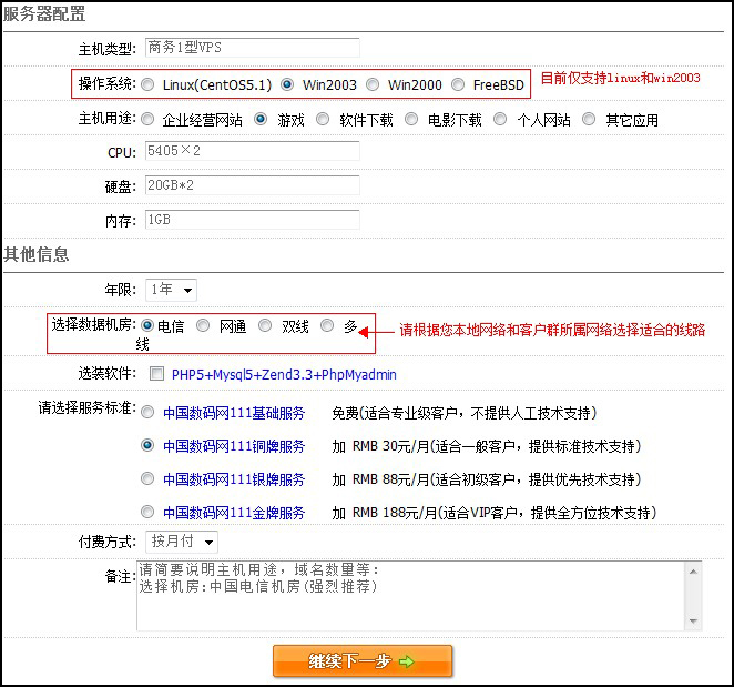 服務(wù)器配置部分,請選擇您需要的操作系統(tǒng),目前我司僅支持linux(centos5)和win2003,選擇機房時,請根據(jù)您本地 的線路和客戶群的線路選擇適合的機房。選裝軟件請打鉤。如圖: