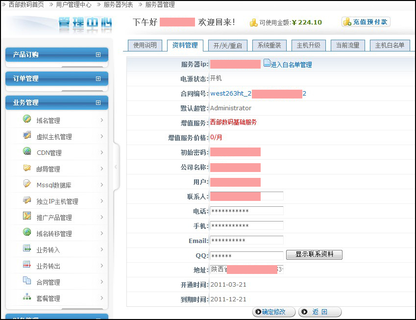 管理員開通后,客戶即可在自己的管理中心查看到相關(guān)的價格、到期日期、VPS登陸賬戶及密碼等信息,若要提交白名單和 更多管理,請點擊最右側(cè)的“白名單”或直接登錄www.myhostadmin.net。如圖: