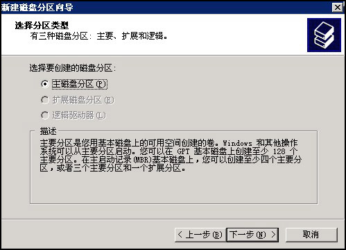在“新建磁盤分區(qū)向?qū)А秉c(diǎn)擊下一步,如圖: