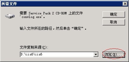 7、安裝時(shí)提示“需要Serveice Pack 2 CD-ROM 上的文件 'convlog.exe'”,點(diǎn)“瀏覽”指向到您的IIS6組件包的目錄,目錄中會(huì)顯示文件“Convlog.ex_”,然后按“確定”。提示需要其他文件時(shí),也按此操作,若您勾選了以上說明以外的組件,可能因?yàn)榻M件包中未包含,導(dǎo)致安裝失敗。如圖: