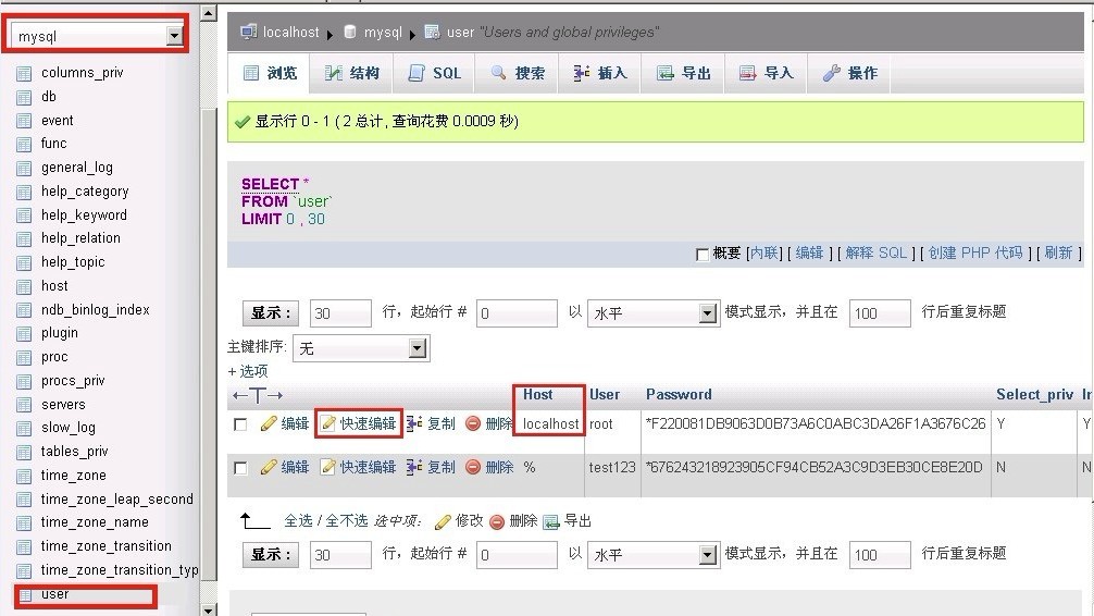 1、Windows系統(tǒng)主機(jī): 方法①、可以用phpmyadmin連接登陸mysql,選擇mysql數(shù)據(jù)庫,打開user表,選擇您需要開啟遠(yuǎn)程連接的用戶,點(diǎn)快速編輯,將host列里面的值修改為%就可以完成。