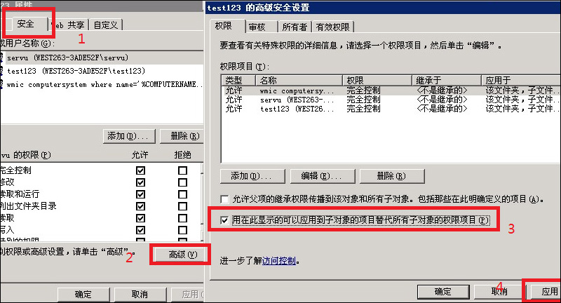 如果這些權(quán)限本身就存在,訪問(wèn)還是提示未授權(quán),請(qǐng)右鍵站點(diǎn)目錄—屬性—安全—高級(jí)—勾選“用在此顯示的可以應(yīng)用到子項(xiàng)目替代所有子對(duì)象的權(quán)限項(xiàng)目”—應(yīng)用確認(rèn),如圖: