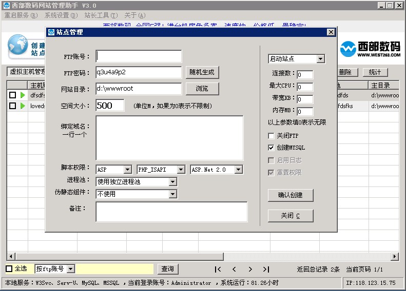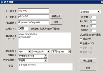 1. 網(wǎng)站管理:一鍵添加網(wǎng)站(IIS)、添加網(wǎng)站FTP、自定義網(wǎng)站目錄、創(chuàng)建MySql數(shù)據(jù)庫(kù)、自定義網(wǎng)站支持腳本(如:asp/php/asp.net)、站點(diǎn)權(quán)限獨(dú)立設(shè)置。