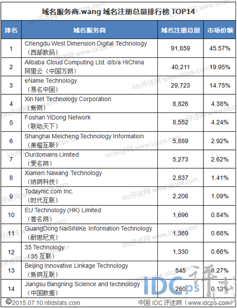IDC評述網(wǎng)(idcps.com)07月13日報道:根據(jù)ntldstats.com發(fā)布的最新數(shù)據(jù)顯示,截止至2015年7月10日17時30分,.wang域名注冊總量十四強排名情況,與上期6月29日相比,無任何變動。其中,西部數(shù)碼較上期凈增18,643個,.wang域名總量升至91,859個,繼續(xù)稱霸.wang域名市場。下面,請看IDC評述網(wǎng)對相關(guān)數(shù)據(jù)的整理與分析。