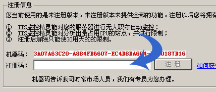 | 2). | 在注冊碼輸入框(蘭色箭頭處)中輸入我們發(fā)送給您的注冊碼 |